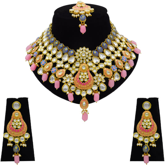 Sujwel Gold-Plated Kundan Necklace Set with Earrings, and Tikka for Girls and Women (08-0533)