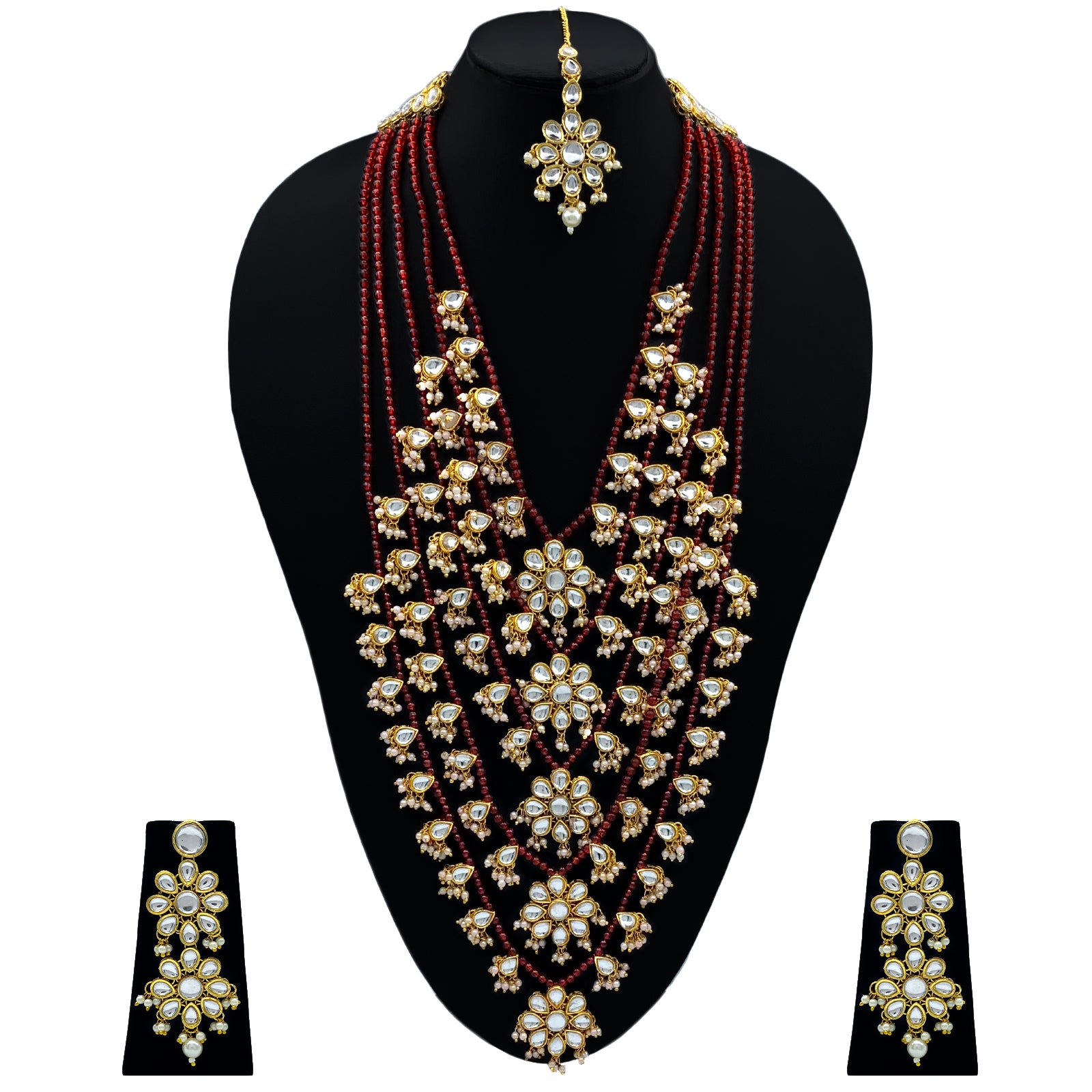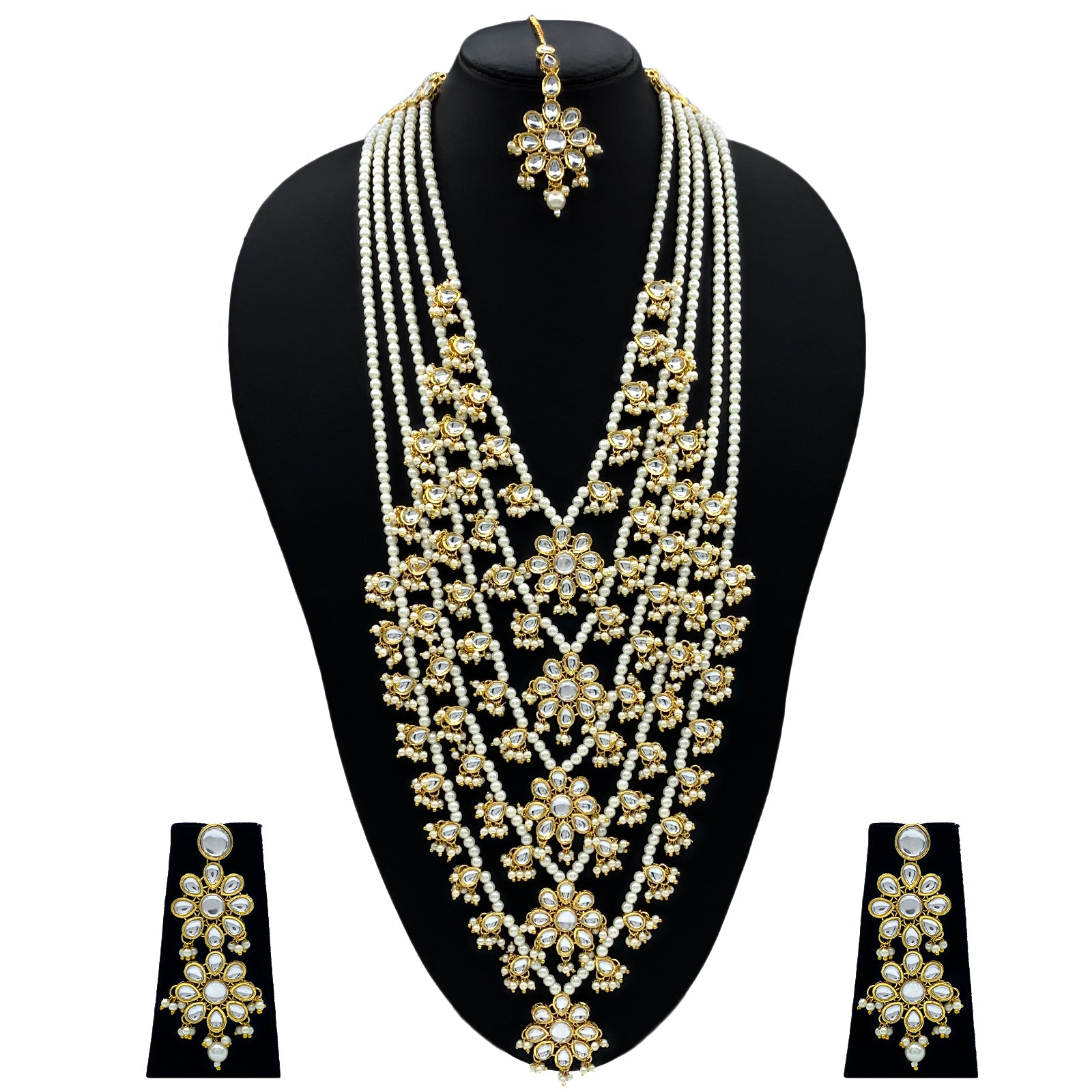 - DESIGN : Gold Plated Kundan Stones & Mother Of Pearl Beads 5 Layered Long Rani Haar Necklace Jewellery Set