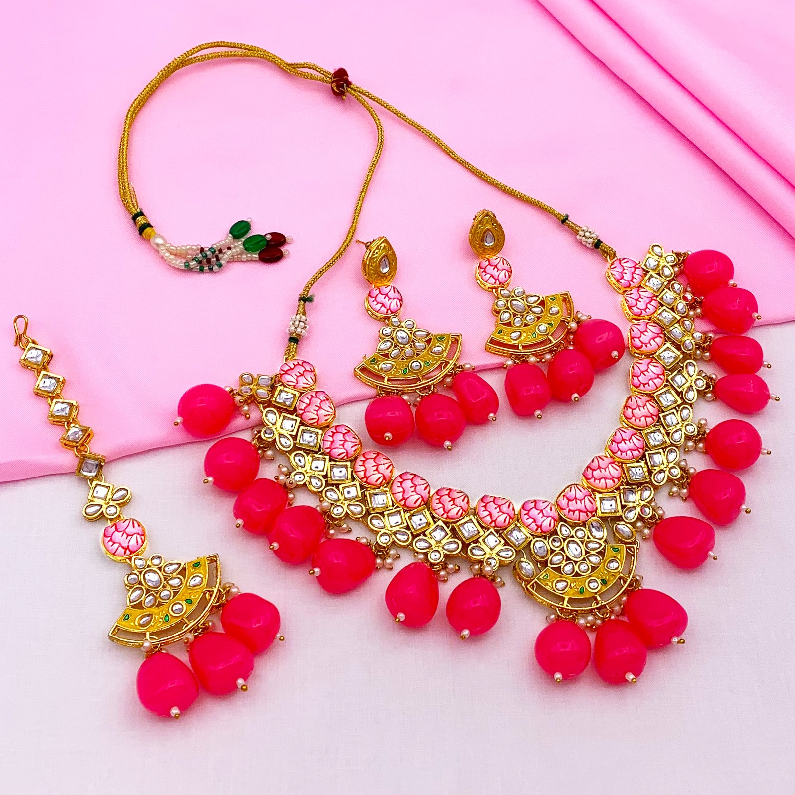 - DESIGN : Gold Toned Laminated Floral Design Beads Choker Necklace Set With Maang Tikka