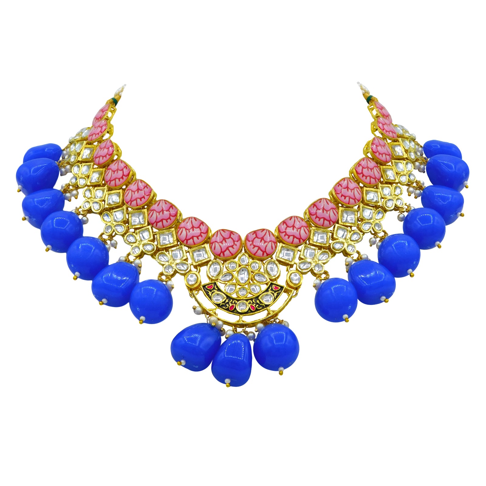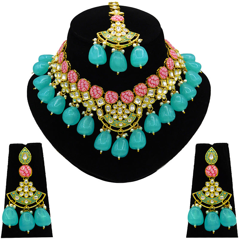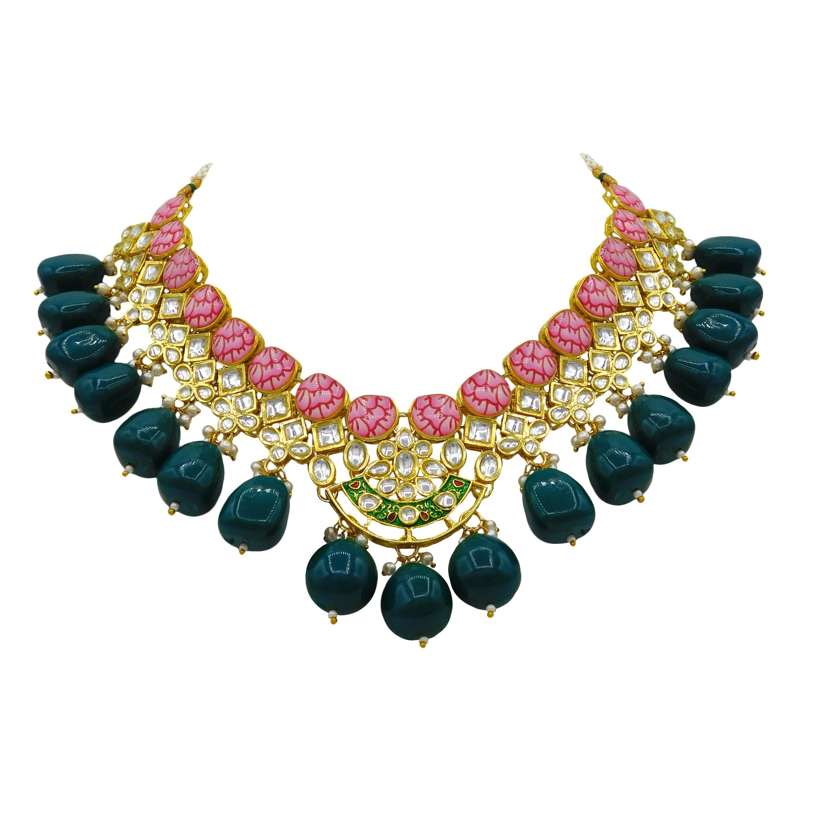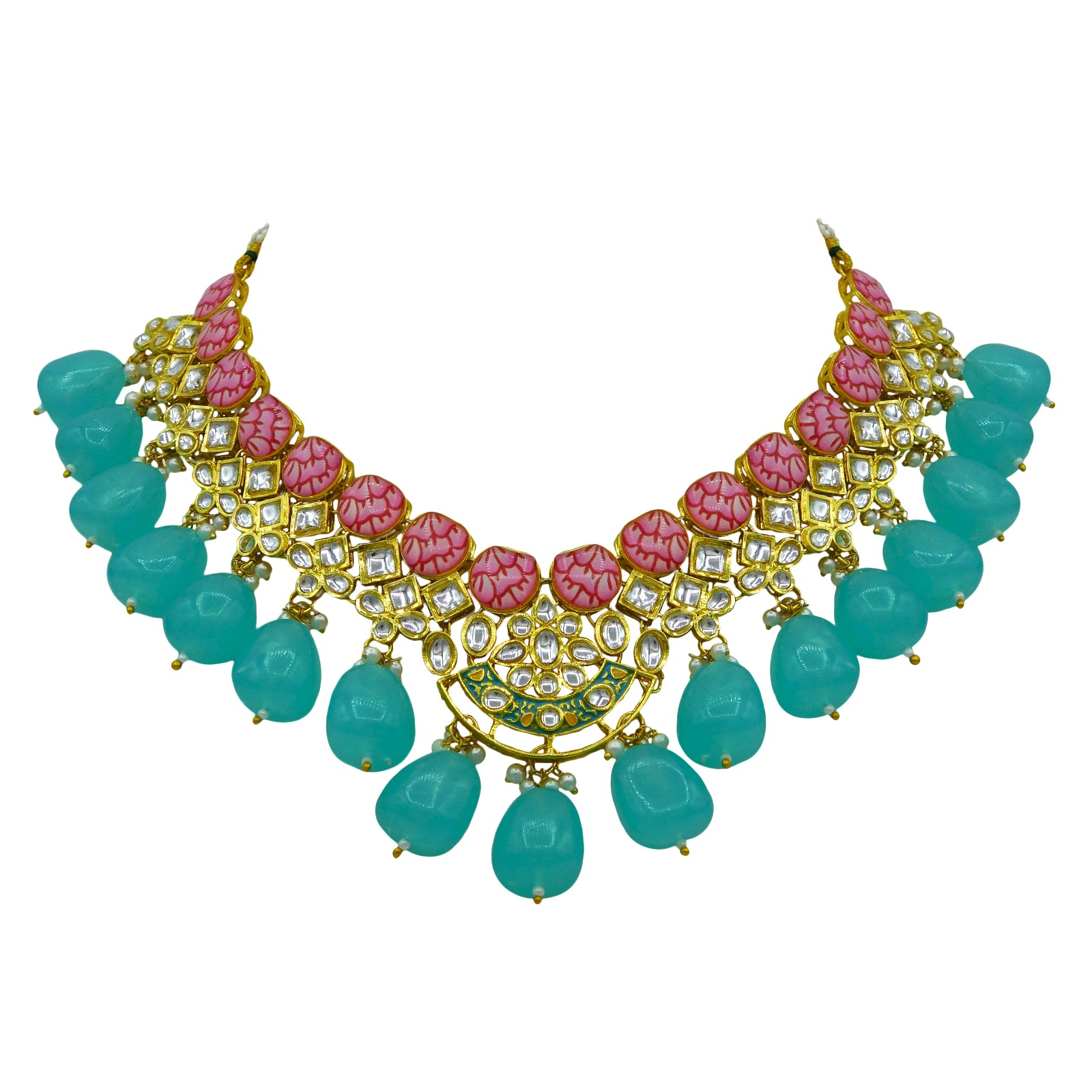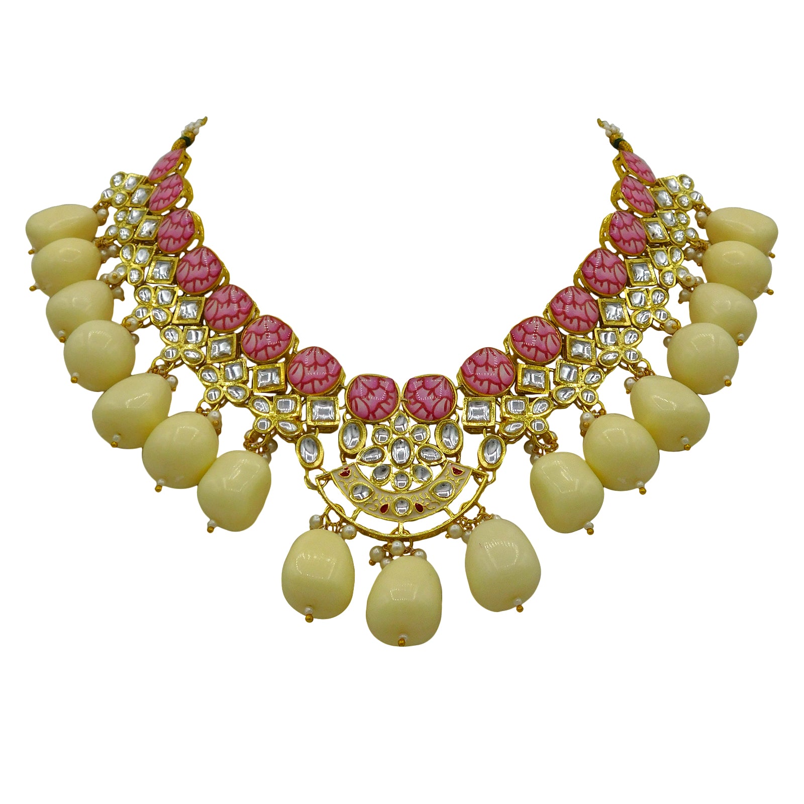 Sujwel Gold Toned Kundan Lamination Floral Design Necklace Set (08-0440)