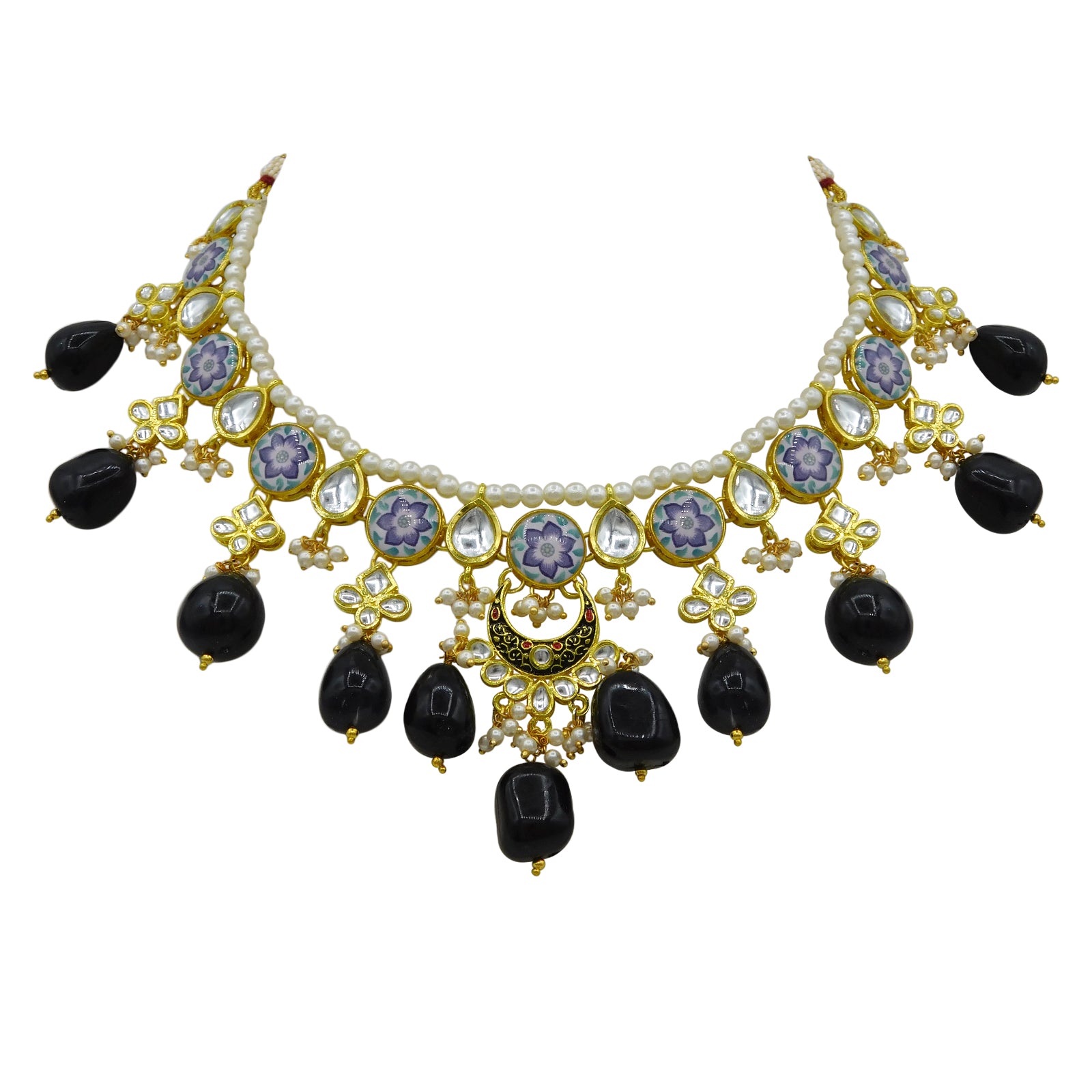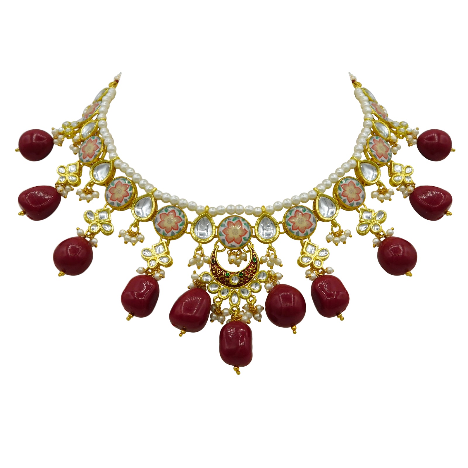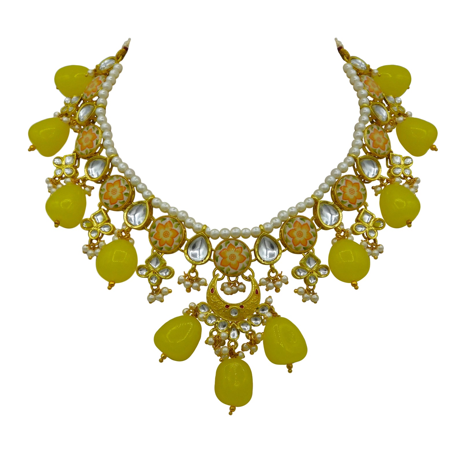 - DESIGN : Gold Toned Kundan Lamination Floral Stoned Design Necklace Set.