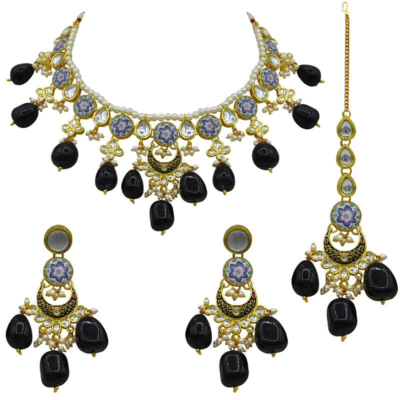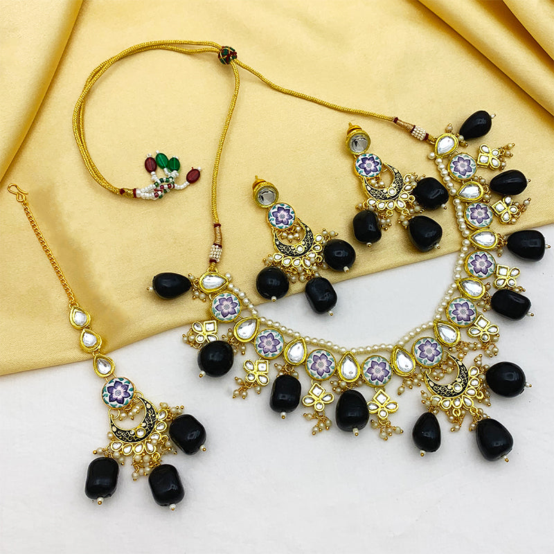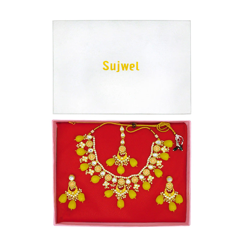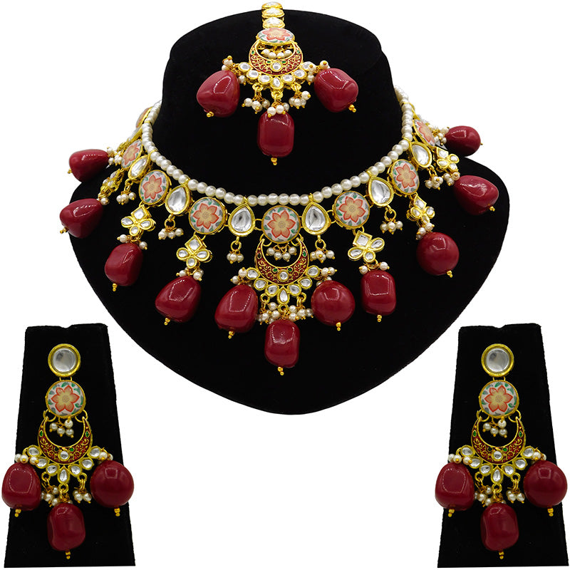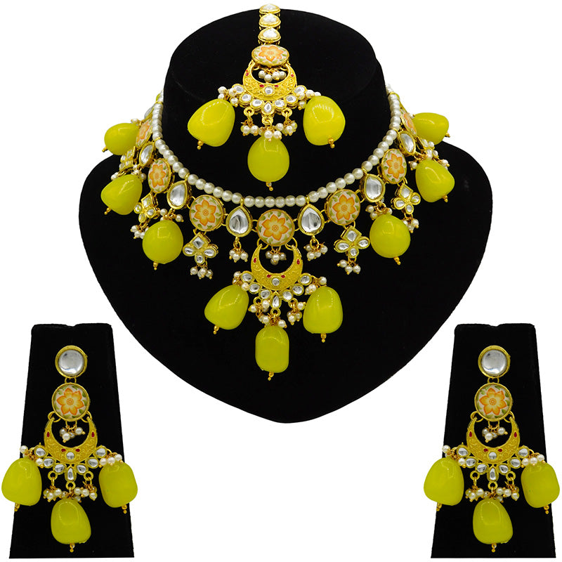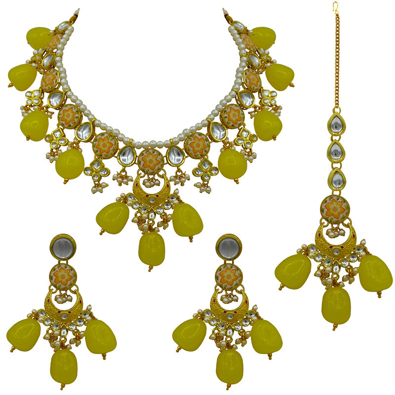 - DESIGN : Gold Toned Kundan Lamination Floral Stoned Design Necklace Set.