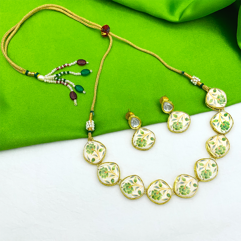 - DESIGN : Gold Toned Kundan Lamination Floral Stoned Design Necklace Set.